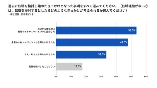 過去に転職を検討し始めたきっかけについて聞いたところ、「自分から積極的に転職サイトやエージェントに登録した」が53.5%で最多だった一方、「企業や人材エージェントから声をかけられた」も48.0%、「友人・知人から声をかけられた」が33.5%と、外部からの声かけがきっかけとなった割合も高いことがわかりました。