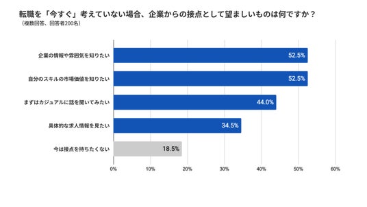 - 転職を今すぐ考えていない場合でも、52.5%が「企業の情報や雰囲気を知りたい」「自分のスキルの市場価値を知りたい」と回答し、44.0%が「まずはカジュアルに話を聞きたい」と回答