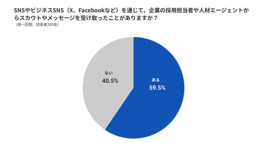 SNSやビジネスSNS(X、Facebookなど)を通じて、企業の採用担当者や人材エージェントからスカウトやメッセージを受け取った経験について聞いたところ、59.5%が「ある」と回答しました。