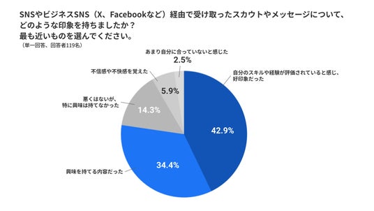 SNS経由で受け取ったスカウトやメッセージへの印象について聞いたところ、「自分のスキルや経験が評価されていると感じ、好印象だった」が42.9%で最多、次いで「興味を持てる内容だった」が34.4%となり、合わせて77.3%がポジティブな印象を持っていることがわかりました。