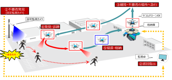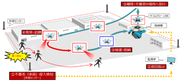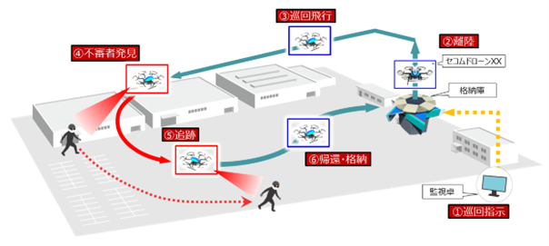 セコムは2015年12月に、敷地内への侵入があった際に不審者を自律飛行で追跡し、その映像をセコムのコントロールセンターに送信して迅速・的確な対応につなげる、民間防犯用として世界初の「セコムドローン」を実用化。ご契約先の敷地内において、レベル3飛行※3による商用サービスを日本で初めて実現し、約8年もの間、運用実績・ノウハウを積み上げてきました。