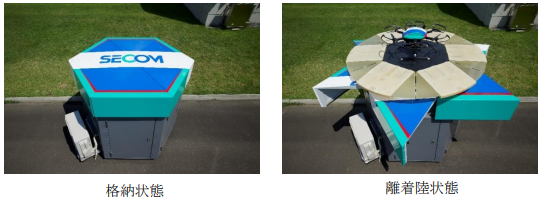 「セコムドローンXX」の格納・離着陸・バッテリー自動交換/自動充電・機体のセルフチェック機能を持つ格納庫です。離陸する際は六角形の格納状態から、上部の自動開閉式屋根が放射状に展開し、リフト機構でドローンを持ち上げ、離着陸台を自動で展開します。ドローンが飛行から戻ってくると、着陸後にはドローンの位置を自動で修正し、格納します。格納後は自動でドローンのバッテリー交換を行い、短時間で次の飛行を実施することが可能です。飛行前のセルフチェックも定期的に実施します。