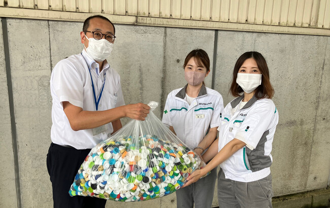 株式会社スギノマシンではSDGsの取り組みとして、2022年1月からペットボトルキャップの回収を行っています。回収から8カ月で、90リットル袋で3袋分のペットボトルキャップが集まり、富山県でペットボトルキャップの回収を担っている株式会社公生社へ届けました。