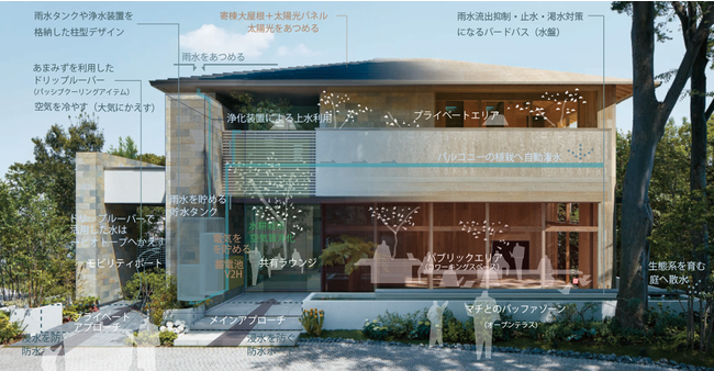この度、優秀賞を受賞したコンセプト住宅は、自然資源の活用に加え、激甚化する自然災害や感染症の流行、空き家増加など、複雑化する社会課題を解決する未来住宅として、住まいづくりの体感施設・ミサワパーク東京に建設。建設地の地域課題に、集中豪雨による浸水被害の増加や非常時の水資源調達などが挙げられるなか、大屋根による雨水・太陽光など自然資源の収集やパッシブクーリングアイテム、貯水・止水機能をもつ水盤などグリーンインフラを生かした防災・減災設備を建築と一体的にデザイン。家族の暮らしや健康とあわせて、環境のサステナビリティを実現しています。