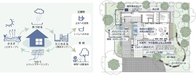 【雨水の循環デザインと雨水を活用した外構計画のイメージ】