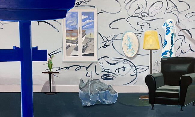 一見成立しているように見せかけ、実は破綻した画面構成に見慣れた風景に感じる違和感、日常生活に潜む奇妙さを表現。また、アナログペインティングと3DCGをジークレー(※)プリントで出力した作品を並列することで、めまいのような鑑賞体験を生み出そうとします。