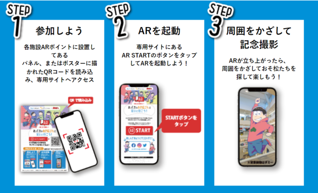 画像はAR起動ページです。スマートフォンで読み込むとご覧いただけます。各施設に設置されたQRを読み込むことで期間限定のAR「おそ松さん」を起動させることができます。