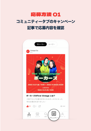 日本初のヴィンテージ・ファッション・アプリ「Vintage.City(ヴィンテージ・シティ)」内の「コミュニティ」ページに公開される「キャンペーン記事」で応募内容を確認