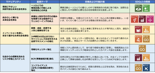 当社は、事業の信頼性を高め、持続可能な社会に貢献することを目指しています。そのために取り組むマテリアリティ(重要課題)を「環境にやさしい持続可能な未来社会を創る」、「自分らしく輝ける未来社会を創る」、「イノベーションを通じ、安全で豊かな未来社会を創る」、「社会からの信頼を高めるリスク管理とガバナンス」と特定し、それぞれの重要テーマと目標および行動計画を定めました。