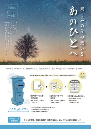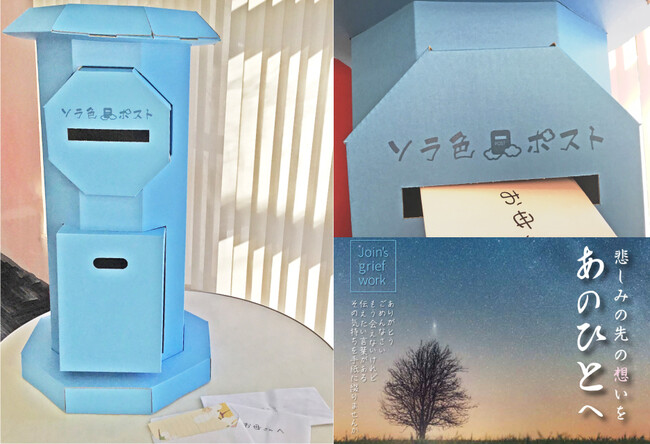 「ソラ色ポスト」は冠婚葬祭業である株式会社ジョイン様が実施されているグリーフケアのひとつです。グリーフケアとは遺族の複雑で深刻な心の状態を理解して寄り添うことで回復のサポートをする取り組みのこと。