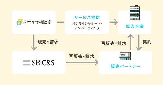 株式会社Smart相談室(本社:東京都港区、代表取締役・CEO:藤田 康男、以下「当社」)は、大手ITディストリビューターであるSB C&S株式会社(本社:東京都港区、代表取締役社長 兼 CEO:草川 和哉、以下「SB C&S」)が連携する全国約13,000社の販売パートナー経由でのオンライン対人支援プラットフォーム「Smart相談室」の販売を開始いたしました。なお、サービスと各種サポートは当社から導入企業に直接提供されます。