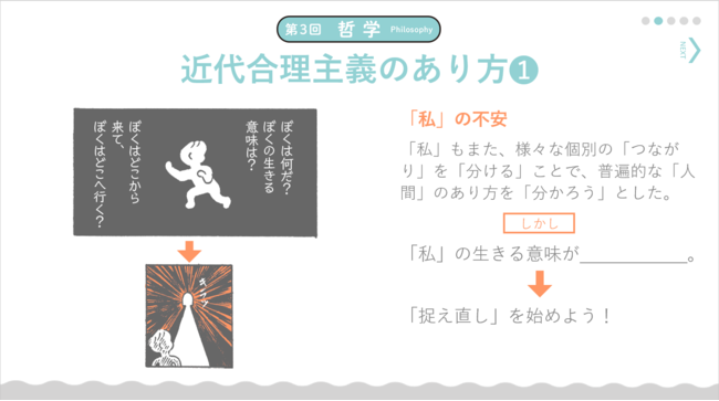 中世以降の哲学の変遷を、「私」の捉え方という観点からストーリー化していきます。それぞれの時代で「私」はどのように捉えられていたのかという大きな流れを通して、各時代の有名な哲学的立場も知ることができます。