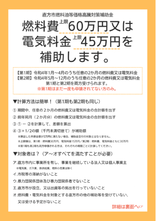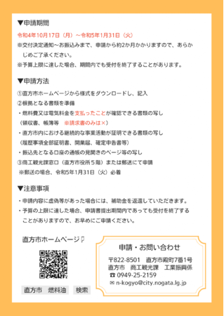 新型コロナウイルス感染症等に起因する経済情勢の変化により、燃料油等の価格高騰の影響を受ける市内事業者を支援するため、令和4年10月17日(月)から「直方市燃料油等価格高騰対策補助金」第2弾の受付を開始します。