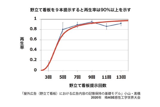 野立て看板は24時間365日、集客をし続けてくれます。野立て看板を複数設置することで、「あそこでも見た。昨日も見た!」という記憶が脳に刷り込まれ、ターゲットが必要とした時に思い出してもらえます。9本以上の野立て看板を掲示すると再生率は90%以上を示し、商圏内で圧倒的な認知が獲得できることがわかっています。