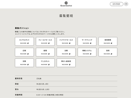 今までのGrand Centralの強くてスタイリッシュなイメージから、採用サイトは白やグレーを基調とした柔らかいイメージに変更しており、多くの求職者様に親しみやすいデザインとなっております。