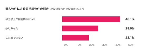 - 現役の築古戸建投資家(n=77)の48.1%は、これまで購入した築古戸建のうち「半分以上が相続絡みの物件」だと回答。相続登記未了、相続人多数などの事情が絡む物件が投資家の仕入れ対象になっている実態が確認されました。