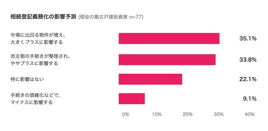 本調査でも、相続登記の義務化が築古戸建投資に与える影響について、「市場に出回る物件が増え、大きくプラスに影響する」35.1%、「売主側の手続きが整理され、ややプラスに影響する」33.8%となり、合計68.8%がプラス評価でした。一方で「手続きの煩雑化などで、マイナスに影響する」も9.1%あり、制度変更が即座に取引円滑化だけを生むわけではなく、実務負担の増減が並走することも示されています。