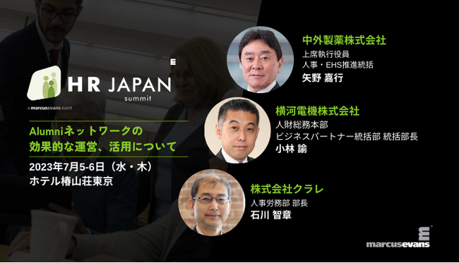 マーカス・エバンズ・イベント・ジャパン・リミテッド(本社:英国/日本支社代表:雪下 大輔、以下「マーカスエバンズ」)が主催する人事部門のビジネスサミット「HR Japan Summit 2023」に中外製薬株式会社の矢野 嘉行氏、横河電機株式会社の小林 諭氏、株式会社クラレの石川 智章氏の登壇が決定したことをお知らせします。