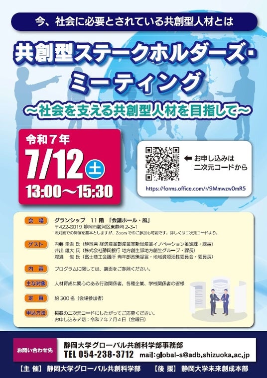静岡大学では、令和5年4月に開設したグローバル共創科学部が育成する共創型人材の必要性や意義を地域社会に理解してもらうとともに、双方にとって意味のある共創型カリキュラムのあり方について話し合う場として、「共創型ステークホルダーズ・ミーティング」を下記のとおり開催しますので、お知らせします。