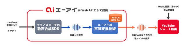 今回提供したAPIは、ユーザーが入力した歌詞に基づいて、テクノスピーチのAI歌声合成SDKで生成した音声を、エーアイの声質変換技術でRG氏の声に変換することで、まるで本人が歌唱したような歌声を作成するものです。音声や歌声を、有名人やキャラクターなど指定の話者の声質に変換できるため、様々なキャンペーンに活用可能なソリューションです。