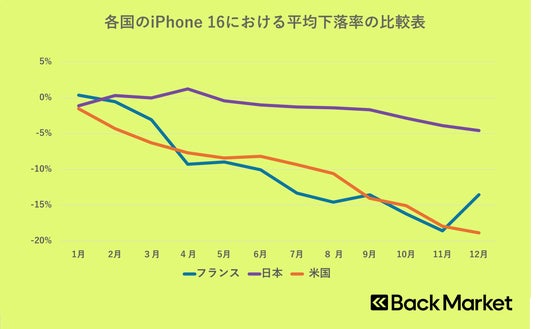 - 発売からまもないiPhone 16はフランス・米国で大きな下落が始まるも、日本では最大下落率4.6%と鈍化傾向に