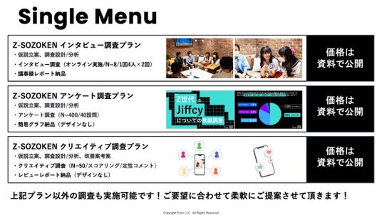 Z世代に特化したクリエイティブカンパニーFiom合同会社(本社:東京都渋谷区、代表社員:竹下洋平)は、2026年3月23日(月)にZ世代同世代目線による分析で新たなインサイトを発掘・探求するZ世代特化の次世代型シンクタンクZ-SOZOKEN(Z世代創造性研究所)より、「Z世代調査研究メニュー」の提供を開始いたしました。