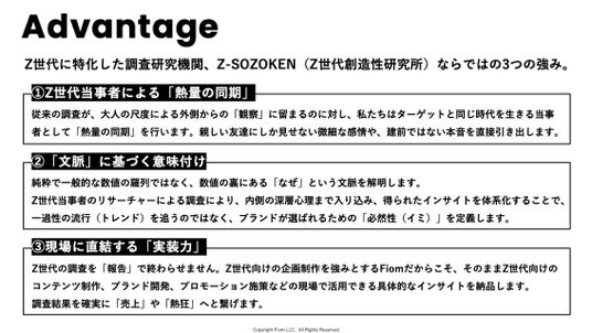こうした企業とZ世代の間にある「感覚のズレ」を明確にし、共感を生む本質的なマーケティング戦略の基盤を提供するために、私たちFiomはZ世代に特化した次世代型シンクタンク「Z-SOZOKEN」から本調査研究メニューの提供に至りました。