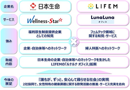 株式会社LIFEM(ライフェム、以下、「当社」)は、日本生命保険相互会社(以下、「日本生命」)と、女性の健康課題改善に向けた協業に関する基本合意書を2024年11月に締結しました。