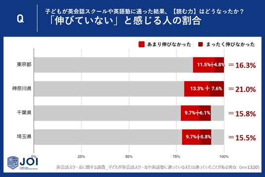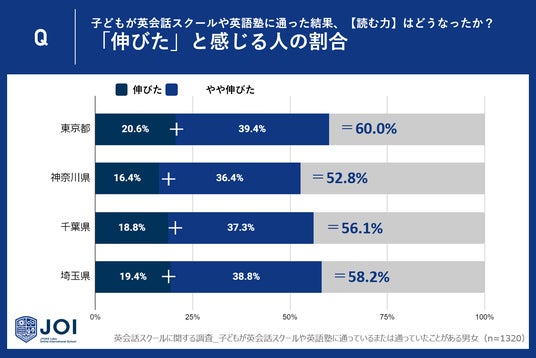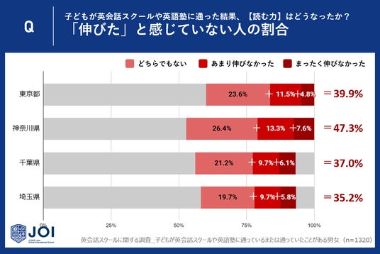 東京都、神奈川県、千葉県、埼玉県の一都三県で子供を英会話スクール、英語教室や塾に通わせている、または通わせたことがある親に「英語を読む力(リーディング力)」に関する成果をアンケートしたところ、成果の実感に地域差が見受けられました。