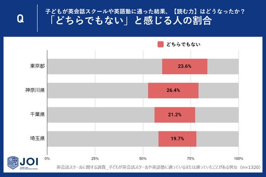 じゅけラボOnlineインターナショナルスクールJOI(所在地:大阪市北区、代表取締役:後藤智則)は、子どもが英会話スクールや英語教室に通っているまたは通っていたことがあると回答した一都三県(東京都330人・神奈川県330人・千葉県330人・埼玉県330人)の親に英会話スクールや英語教室における「英語を読む力(リーディング力)」の成果に関するアンケート調査を実施しました。