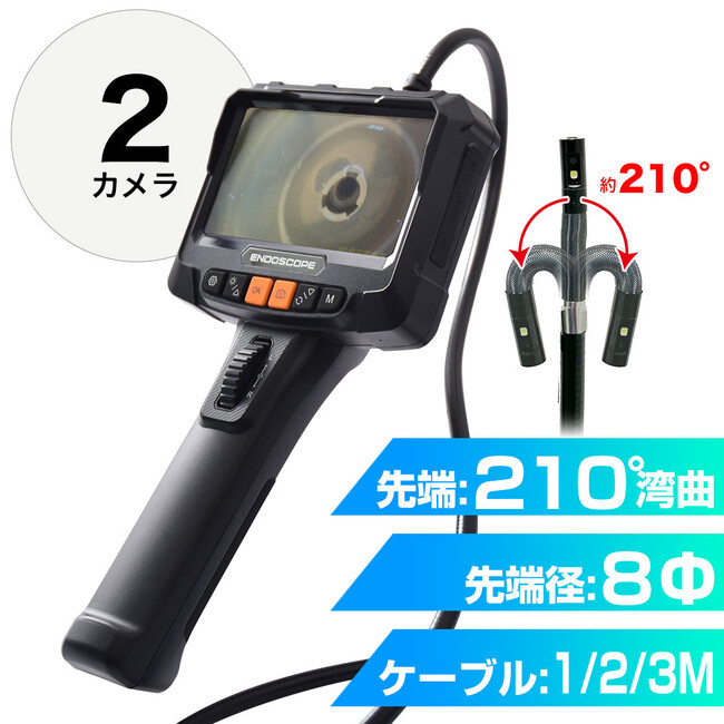 本製品は先端カメラ径8mm、正面と側面にカメラを搭載し手元操作で210度カメラが動く工業内視鏡です。