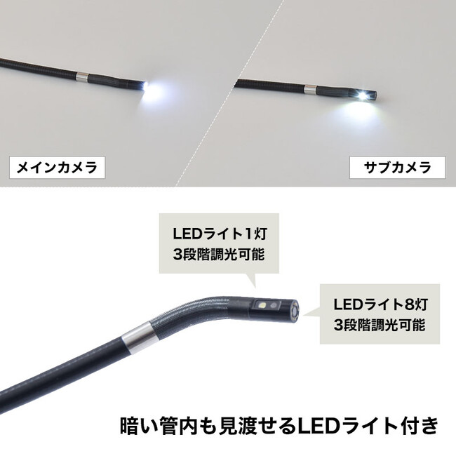 ・光源/メインカメラ:LED8灯 3段階調光/サブカメラ:LED1灯 3段階調光