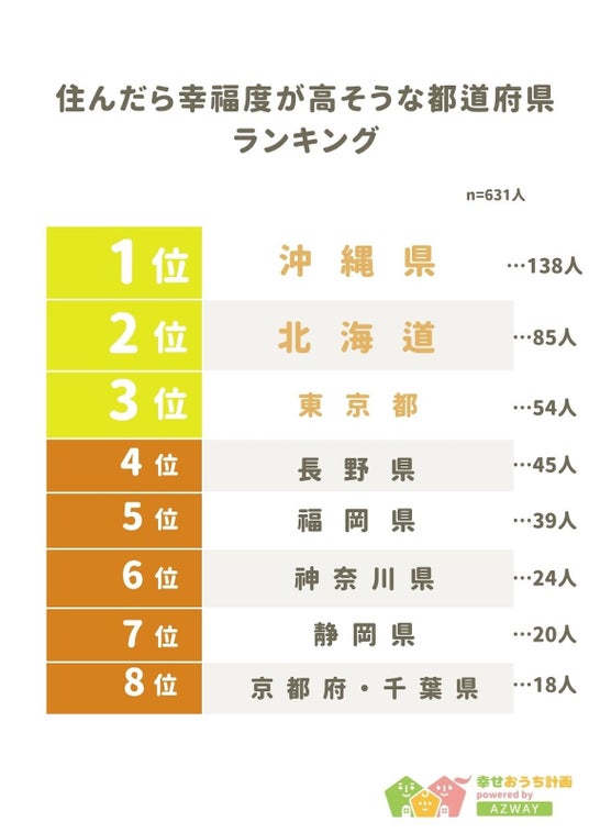 今回、株式会社AZWAY(https://azway.co.jp/)が運営する、幸せおうち計画(https://azway.co.jp/media/)は、10代から60代以上までの631人を対象に「住んだら幸福度が高そうな都道府県」についてアンケート調査を実施しました。