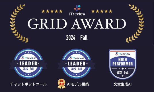 Generative AIの社会実装を推進するカサナレ株式会社(本社:東京都渋谷区、代表取締役:安田喬一)は、IT製品レビュープラットフォーム「ITreview」で発表された「ITreview Grid Award 2024 Fall」において、ユーザーから高い評価を受け、「AIモデル構築」部門で3期連続「Leader」受賞、「チャットボットツール」は今回初となる「Leader」を受賞。さらに、「文章生成AI」部門で「High Performer」を受賞したことをお知らせいたします。