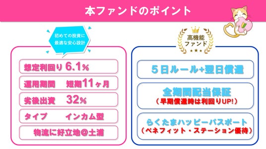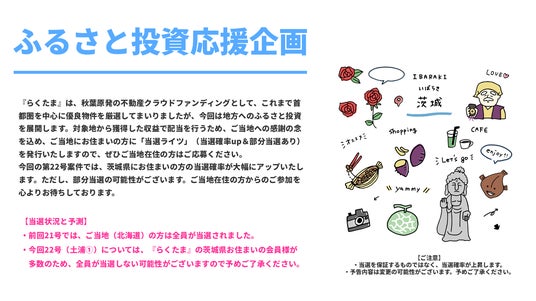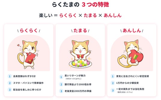 『らくに、たまる』をコンセプトに、不動産知識や投資経験が少ない方でも、1万円から楽しく安心して参加できるファンドをつくります。『らくたま』は投資家ファーストでいつも考えます。