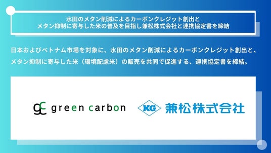 Green Carbon株式会社(代表取締役:大北潤、以下Green Carbon(読み;グリーンカーボン))はこの度、兼松株式会社(本社:東京都千代田区、代表取締役社長:宮部 佳也、兼松)と、 日本およびベトナム市場を対象に、水田のメタン削減によるカーボンクレジット創出と、メタン抑制に寄与した米(以下、環境配慮米*¹)の販売を共同で促進する、連携協定書を締結したことをお知らせします。