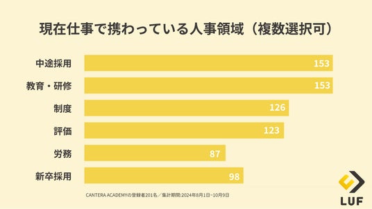 「CANTERA ACADEMY」に登録された人事担当者を対象にしたアンケートの結果、現在携わっている人事領域において「中途採用」と「教育・研修」が最も多いものの、その他の領域でも幅広い人事領域に携わっていることが、今回のアンケートから明らかになりました。CANTERA ACADEMYは、こうした多様なニーズに応えるため、幅広いコンテンツをご用意し、多くの人事担当者をサポートしています。