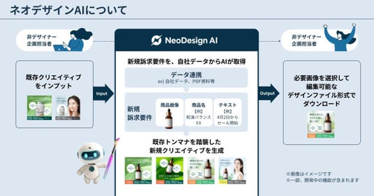 『ネオデザインAI』は、マーケティングに特化した画像生成AIエージェントです。既存のクリエイティブのトーン&マナーを踏襲したデザインテンプレートに対し、訴求したい商材の要件をスムーズに取り込み、編集可能なデザインファイルを生成することが可能です。企業のマーケティング活動における、クリエイティブ制作の工数削減と品質向上を実現することで、企業と顧客とのコミュニケーション活性化に寄与します。