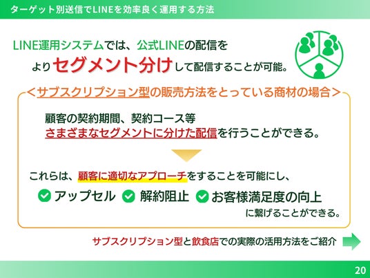 本レポートでは、業界別にLINEを活かした効果的な活用事例も紹介しています。あるレストランチェーンでは、LINEを通じて予約確認やリマインドメッセージを顧客に送信することで、予約の無断キャンセルを減少させています。店内のPOPの掲示や声かけなどで顧客の友達登録を促し、LINEを活用することで、顧客とのコミュニケーションが強化され、売上の向上にも繋がっています。また、LINE運用システムでは公式LINEの配信を、よりセグメント分けして配信することも可能です。例えば、サブスクリプション型の販売方法をとっている商材の場合、顧客の契約期間、契約コース等さまざまなセグメントに分けた配信を定常送信することも可能です。これらは、顧客に適切なアプローチをすることを可能にし、アップセルや解約阻止、お客様満足度の向上に繋げることができます。本レポートでは、業界別の事例や弊社のLINEの活用実績をもとに具体的なLINEの活用方法を理解していただけます。LINEを用いた効果的な集客をご検討されている方におすすめの内容です。