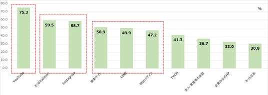 20代が普段利用している媒体はYouTube(75.3%)やX(59.5%)、Instagram(58.7%)などのSNSが中心。
