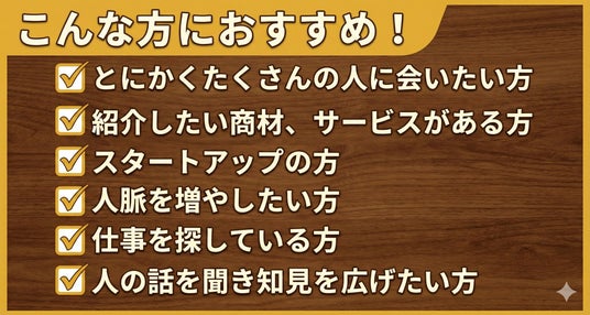 本イベントは、立席パーティースタイルで、気軽に会話や名刺交換ができ、ビジネスの協業相手や人材探し、情報交換に最適な場です。