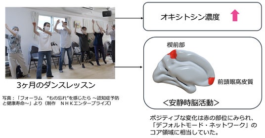 京都大学野生動物研究センター 積山薫特任教授(研究当時、現:ZEN大学知能情報社会学部教授)、島根大学人間科学部 豊島彩講師、福井大学子どものこころの発達研究センター 山下雅俊特任助教らのグループは、もの忘れの自覚をもつ高齢者(平均年齢74歳)が3ヶ月間ダンスの練習をすると、しない群に比べ、「幸せホルモン」とされるオキシトシンの分泌が増大し、安静時の自発的脳活動が活性化されることを見出しました。