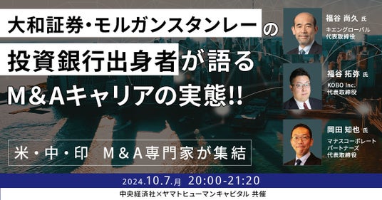 ヤマトヒューマンキャピタル株式会社(本社:東京都千代田区、代表取締役:堀江 大介)は、2024年10月07日(月)20:00よりオンラインにて、中央経済社共催ウェビナー『米・中・印/M&A専門家が集結クロスボーダーM&Aの仕事内容とキャリアの実態を探る!!』を開催いたします。