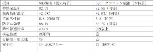 特徴比較(GQD繊維vs本特許複合繊維)(当社グループ調べ)