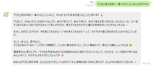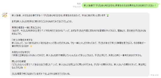 - 自律的思考の育成(「子ども自らに考えさせる」保育方針と同様に、職員自身も気づきを促す問いかけで成長をサポート)