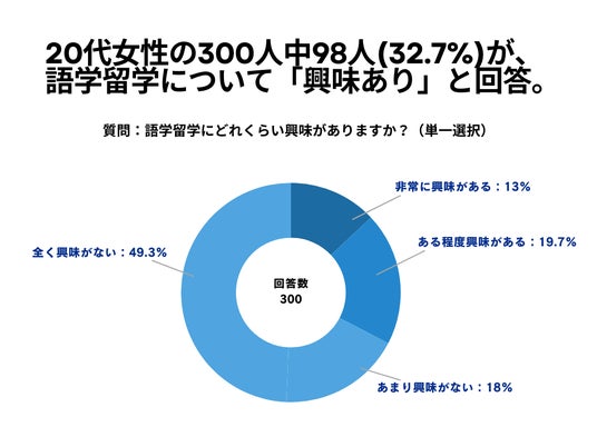 20代女性の300人を対象とした「語学留学にどれくらい興味がありますか?」というアンケートで98人(32.7%)が「語学留学について興味あり」という結果になりました。