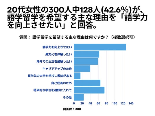 20代女性の300人を対象とした「語学留学を希望する主な理由は何ですか?」というアンケートで128人(42.6%)が「語学力を向上させたい」という結果になりました。