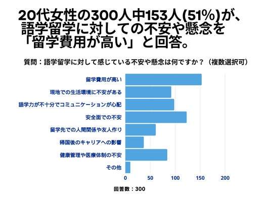 20代女性の300人を対象とした「語学留学に対して感じている不安や懸念は何ですか?」というアンケートで153人(51%)が「留学費用が高い」という結果になりました。