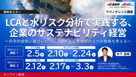 株式会社AIST Solutionsは、国立研究開発法人産業技術総合研究所 ネイチャーポジティブ技術実装研究センター 自然資本サステナビリティ研究チーム 研究チーム長 本下晶晴による、LCA(ライフサイクルアセスメント)と水リスク分析を基礎から学べるセミナー(テクノナレッジ講座)を開催します。