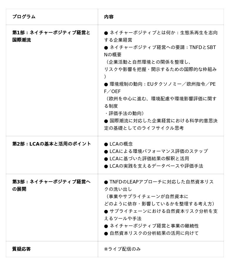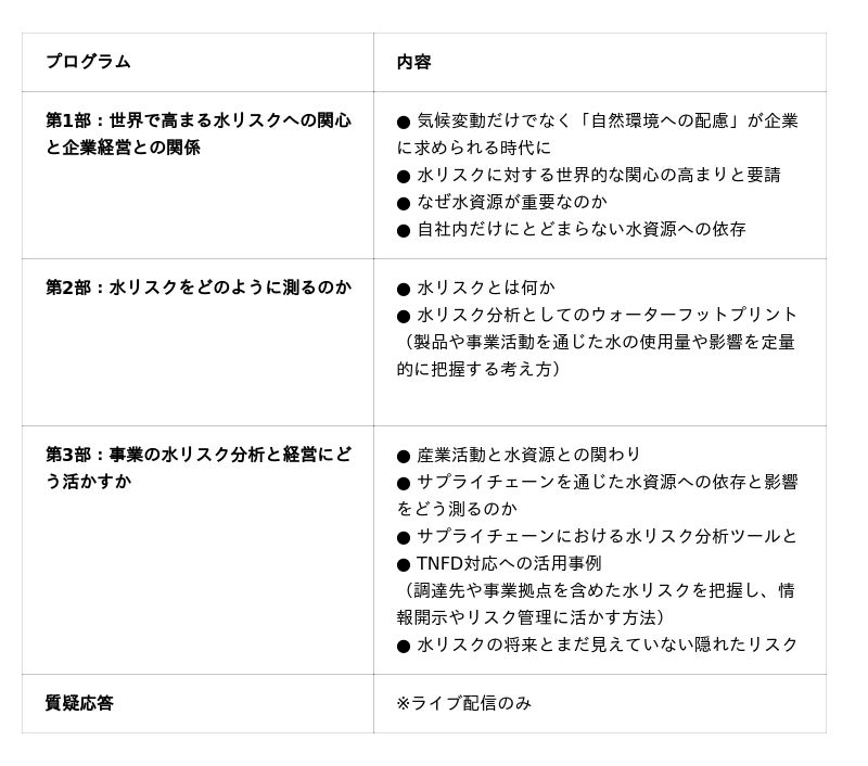 本セミナーは、こうした課題に対し、科学的な手法を使って自然資本の影響を理解し、将来の経営リスクを“今の行動”で減らすための視点を提供することを目的に開催されます。